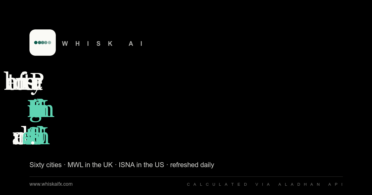 All times come from the open-source Aladhan API and refresh every 24 hours. There's no sign-up, no third-party analytics, no personal data storage. Times are calculated, not observed — your local mosque may publish iqamah times that differ from the calculated adhan. For congregational prayer, follow your mosque's schedule.
